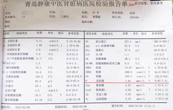 而肾衰竭、尿毒症患者在抽血检查肾功能和电解质时,血磷经常是超标的: