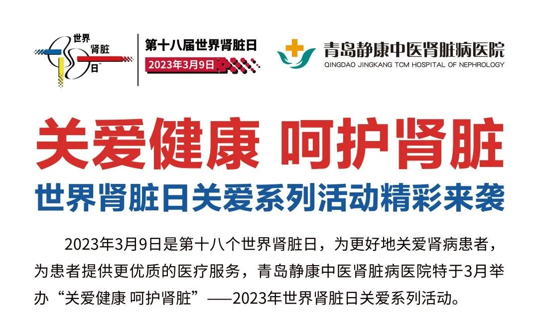 2023年3月9日是第十八个世界肾脏日,为更好地关爱肾病患者,为患者提供更优质的医疗服务,青岛静康中医肾脏病医院特于3月举办“关爱健康 呵护肾脏”——2023年世界肾脏日关爱系列活动。