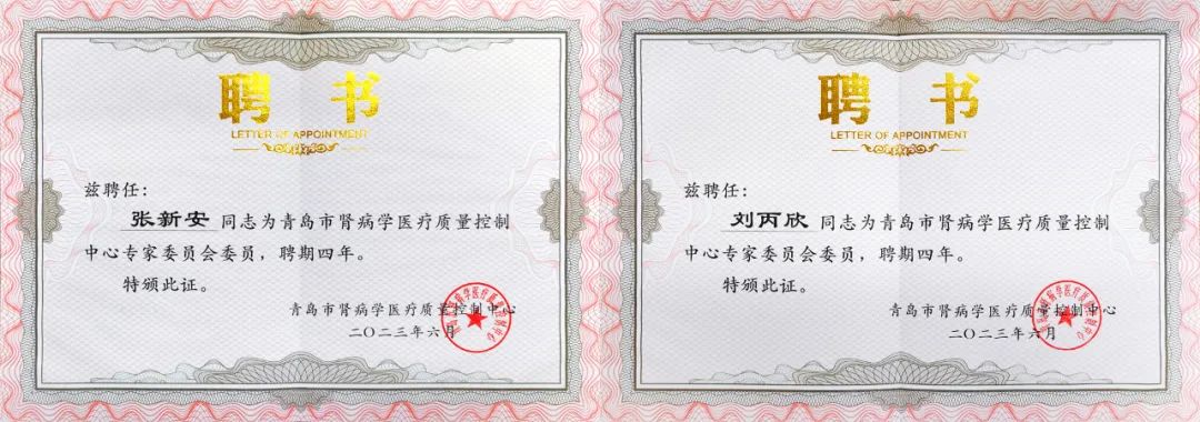 张新安副院长、刘丙欣副院长获聘肾病学专家委员会委员