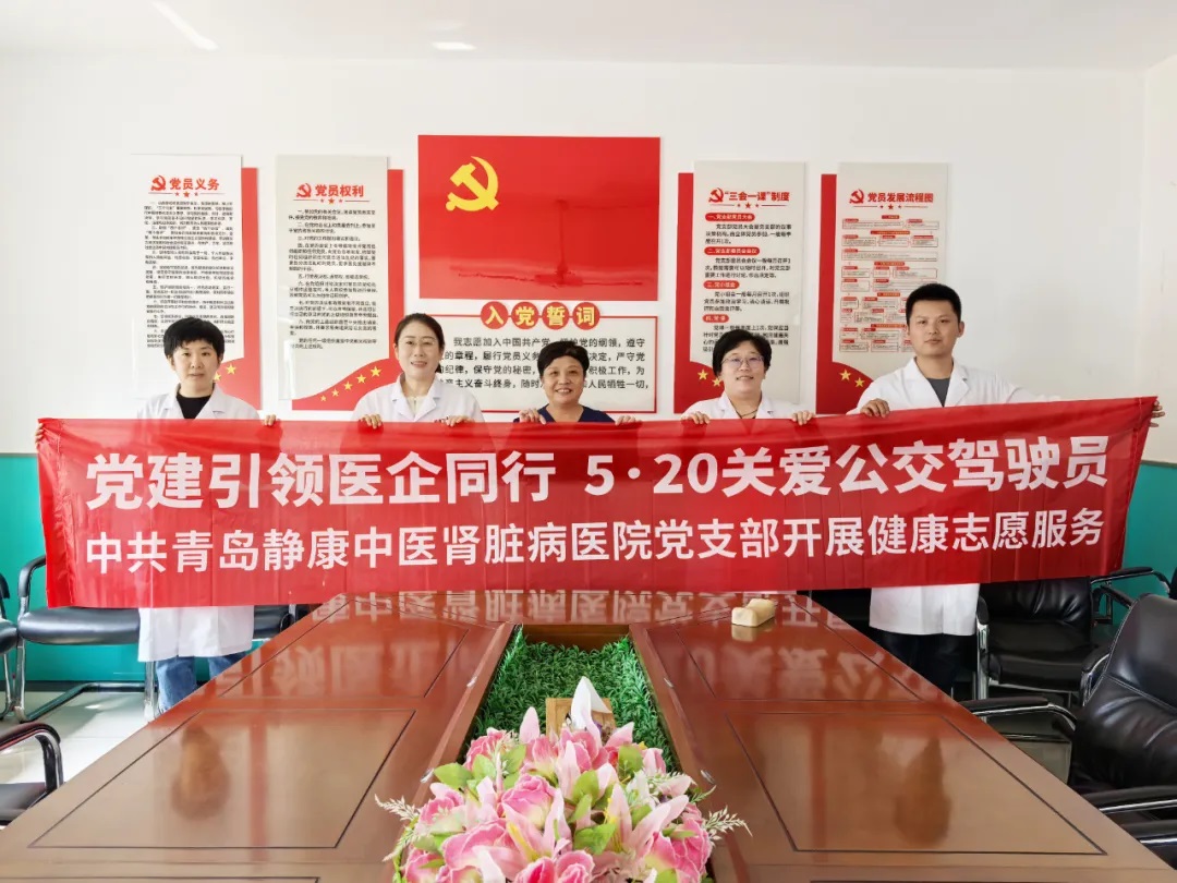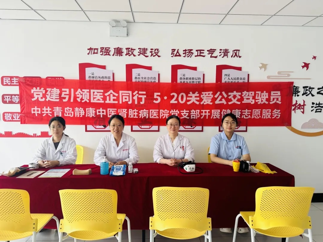 中共青岛静康中医肾脏病医院党支部积极响应党的号召,以党建引领医企携手,于5月20日及21日分别在城运控股交运温馨巴士兴达分公司、城运控股交运温馨巴士有限公司顺达分公司,为公交驾驶员们开展健康志愿服务,寄送温暖与关怀。